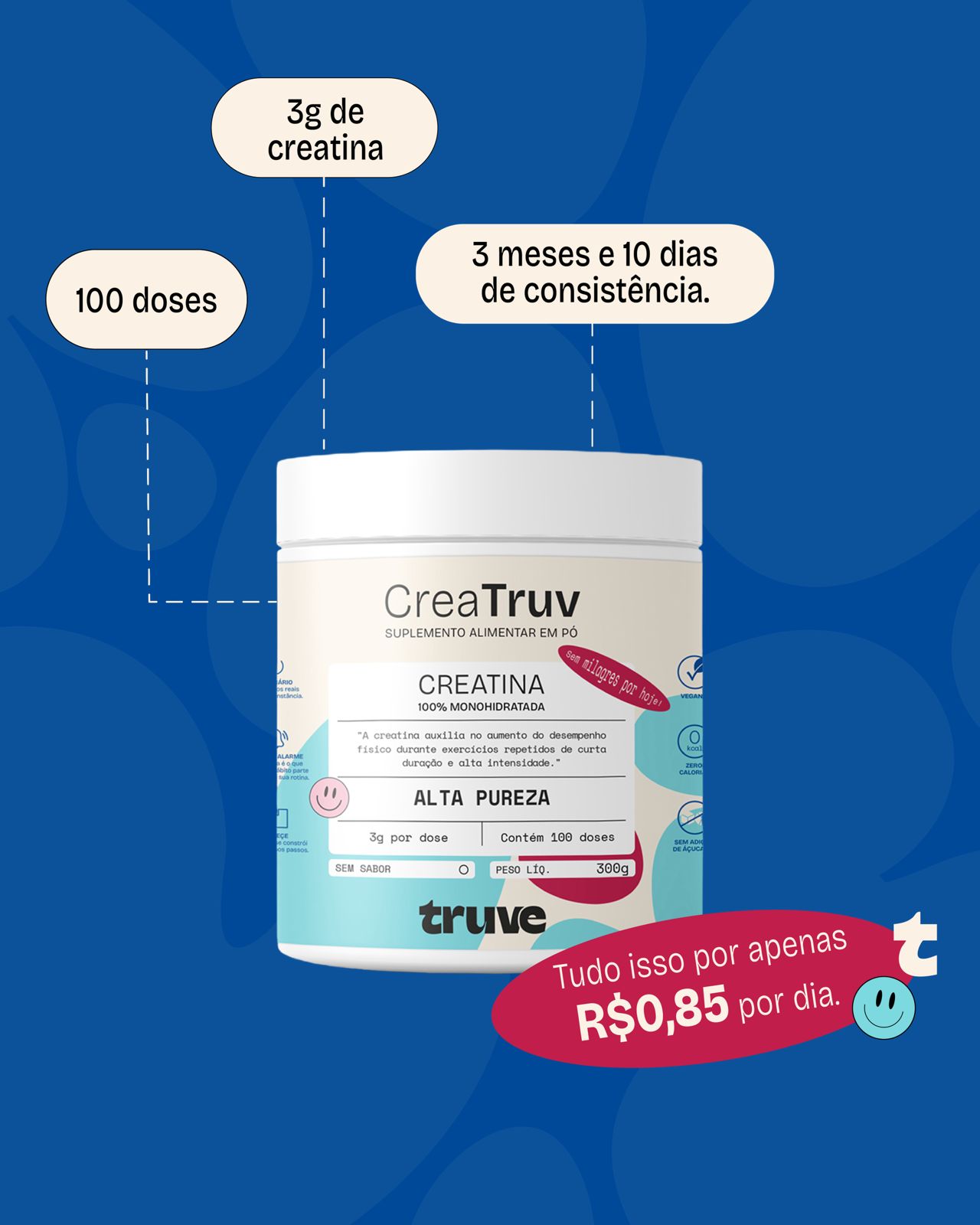 A CreaTruv foi criada para quem treina, para quem não treina, e para quem está começando a se cuidar. A creatina é um composto que o próprio corpo produz — e suplementar é uma forma simples de dar ao organismo o que ele precisa para funcionar melhor, todos os dias.
